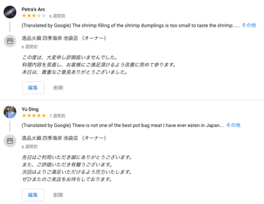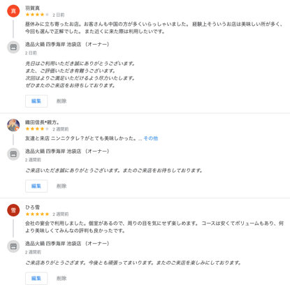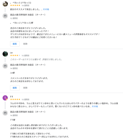 そしてGoogleでの口コミを集めて返信することも大切に対応します。ローカル検索で上位表示されるには、Googleマイビジネスでの口コミ数と高い評価がポイントです。「口コミが多くて評価が高い」=「検索ユーザーに提供する価値がある情報」とGoogleは考え、結果的に上位表示されるようになります。口コミに返信をして顧客とコミュニケーションが取れ、信頼関係が構築しやすくなります。好意的な口コミに対しては、感謝や追加のアピールポイントを伝え、ネガティブな口コミにも丁寧に返信して誠意を見せると効果的です。否定的な意見への返信は抵抗があるものの、真摯な対応がユーザーにとってプラスの体験になる可能性があります。ユーザーの声を真摯に受け止め、口コミ内容を分析し、メニューや接客など店舗の改善につなげるようにしました。